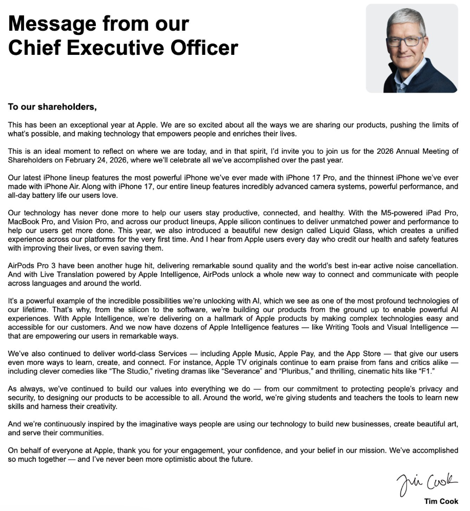 2026年1月9日,苹果CEO蒂姆·库克发布致股东信,将人工智能定位为“当代最意义深远的技术之一”,同时披露了过去一年的产品与战略进展。